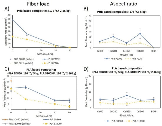 MFR of the polymeric matrices before and after melt-mixing: (A,C) their composites with Cel355 and (B,D) of the composites with fibers having different aspect ratios.