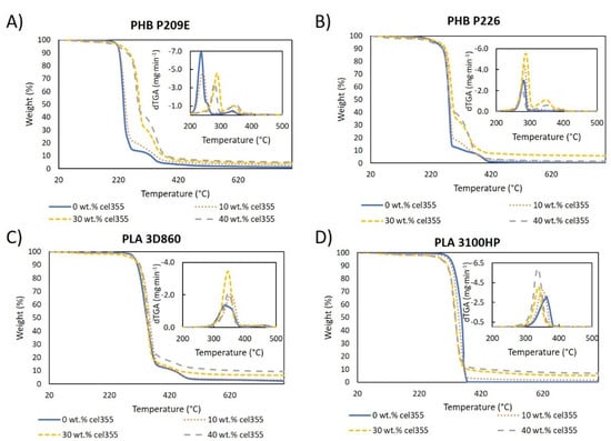 Thermogravimetric and derivative (dTGA) curves of the pure polymeric matrices and composites with different loads of Cel355 (10, 30, and 40 wt.%) in matrices of: (A) PHB P209E; (B) PHB P226; (C) PLA 3D860 and (D) PLA 3100HP.