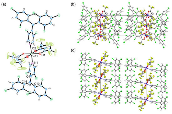 (a) Molecular structure of [CoII(hfac)2(PyBTM)2] in the crystal. (b) Crystal structure viewed along the b-axis and (c) the a-axis. The disorder of trifluoromethyl groups is omitted for clarity.