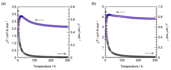The magnetic properties of the complexes were examined using a SQUID magnetometer (Figure 3a). In [NiII(hfac)2(PyBTM)2], the χT value at 300 K was 2.12 cm3·K·mol−1 and was a little higher than the value expected from one S = 1 for NiII and two S = 1/2 spins for PyBTMs (1.75 cm3·K·mol–1 with g = 2.00). The χT value increased with decreasing temperature and reached a maximum around 20 K, indicating an FM interaction dominant between the spins. The subsequent decrease in the χT value below 20 K would be due to the intermolecular AFM interaction, as observed similarly in the other [M(hfac)2(PyBTM)2] complexes [13,16]. The FM interaction can be attributed to the intramolecular exchange interaction between the NiII and the PyBTM spins. The temperature dependence of χT was analyzed by a symmetrical three-spin model with H = −2JM-R(SRSM + SMSR) [20], where SM = 1 or 3/2 for M = NiII or CoII, SR = 1/2, and JM-R indicates an exchange coupling constant between the spins on M and PyBTM. The χT–T plot of [NiII(hfac)2(PyBTM)2] was fitted using Equation (1) [20]. N, μB, and kB indicate the Avogadro constant, the Bohr magneton, and the Boltzmann constant, respectively; x = exp(JM-R/kBT), and θ represents the intermolecular AFM interactions.