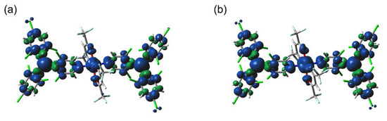 The calculations were carried out using the Gaussian 16 Revision C.01 program package [23]. The geometry of each complex was extracted from the crystallographic data. Single-point calculations were performed assuming either sextet or doublet states for [CoII(hfac)2(PyBTM)2] and quintet or singlet states for [NiII(hfac)2(PyBTM)2], at the uB3LYP level of theory with the LANL2DZ (Hay-Wadt ECP) basis set for the metal atoms and the 6-31G(d) basis set for the other atoms [24,25,26]. The intramolecular exchange interactions were considered within the approximate spin-projection (AP) method proposed by Yamaguchi and co-workers [27,28,29]. Discussion on the difference between the calculated JM–R/kB values and the experimentally obtained ones is provided in the Supplementary Materials.
