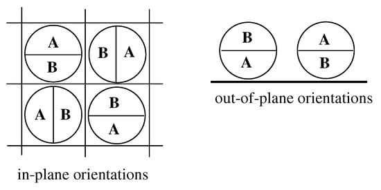 The lowest energy of interparticle interactions in an individual layer is equal to , and is reached for the configurations in which all particles assume the same out-of-plane orientation with their A or B halves down ( or 6), or when the layer consists of stripes, as those shown in Figure 2, with two in-plane orientations, and or and .