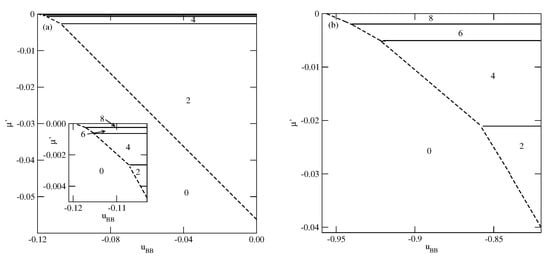 Figure 3, Figure 4 and Figure 5 present the examples of ground state phase diagrams, obtained for different values of , and over the entire range of between 0 and . The phase diagrams for (Figure 3a) and (Figure 3b) are qualitatively the same, and demonstrate that independently of , the film grows via a sequence of layering transitions leading to the films of only even numbers of occupied layers. These phase diagrams also demonstrate that the range of allowing for the formation of wetting layers at increases when the surface potential becomes stronger. In the case of , it is confined to the values of not lower than about , while in the system with , a complete wetting occurs over much wider range of , between zero and about . One should note that the reported here values of , which delimits the regions of complete and incomplete wetting, are slightly different than predicted by Equation (21), due to the assumed finite range of the surface potential. The results demonstrate also that the first layering transition, , involves a simultaneous condensation of increasing number of layers when becomes lower.