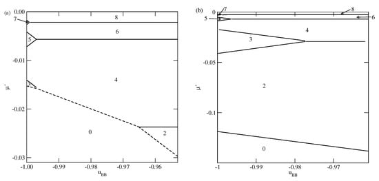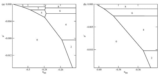 The phase behavior changes when the strength of the fluid–wall potential becomes high enough to ensure a complete wetting over the entire range of , between 0 and . In Figure 4, we present two ground state phase diagrams, for (Figure 4a) and (Figure 4b).