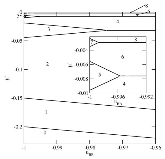The ground state phase diagrams for the systems with . The inset shows the behavior for close to .