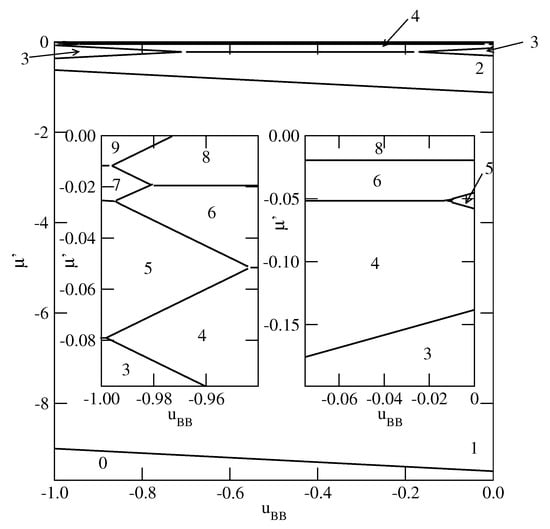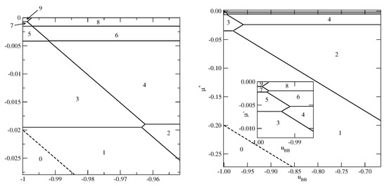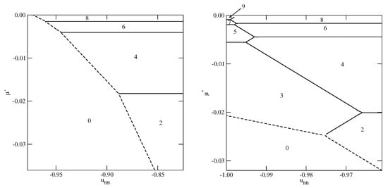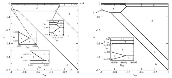 The examples of ground phase diagrams for selected systems with are presented in Figure 6, Figure 7 and Figure 8. Figure 6 presents the phase diagrams for two systems, with and (left panel) and (right panel), in which monolayer films do not appear.