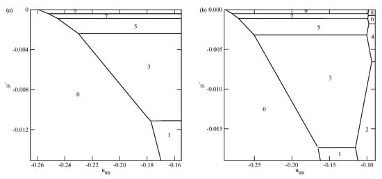 The ground state phase diagrams for the systems with and (a panel) and with and (b panel). The numbers mark the numbers of layers stable in different regions.