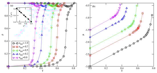 Here we confine the discussion to the systems with , , and with different . Thus, all inter-reactions are non-repulsive, but, in general, the BB attraction has been assumed to weaker than the AA attraction. This choice of parameters seems quite well suited to represent Janus-like particles [50,51,52].