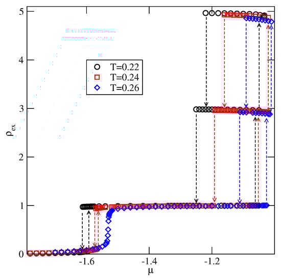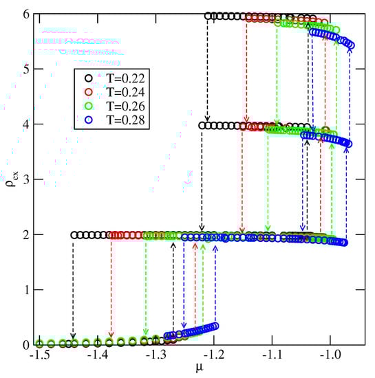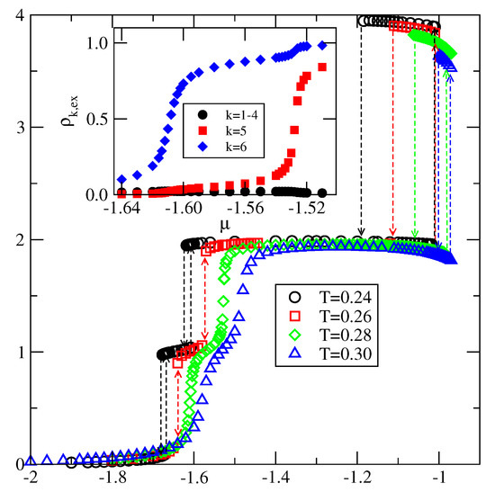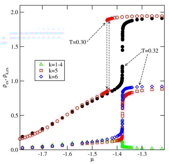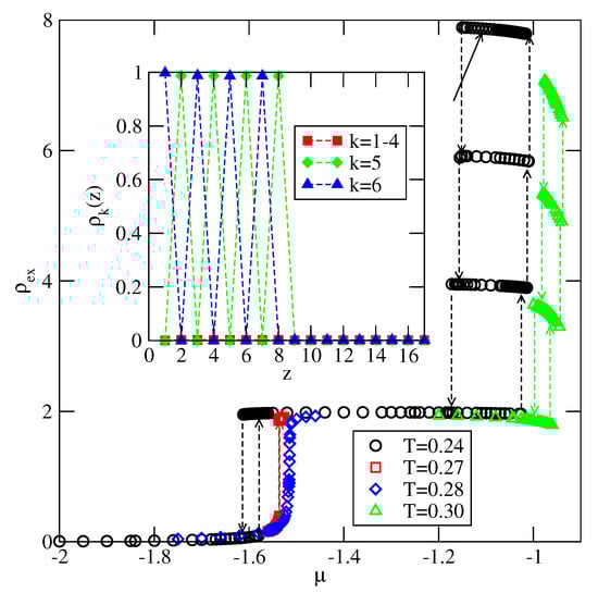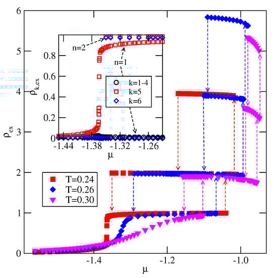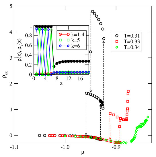 In the last of considered here systems, with , the film exhibits only odd numbers of filled layers. The examples of adsorption–desorption isotherms are shown in the main part of Figure 23. The inset to Figure 23 gives the excess adsorption–desorption isotherms of differently oriented particles at . From the presented results it follows that the developing film has the stacking . Again, the results agree very well with the predictions stemming from the ground state calculations.