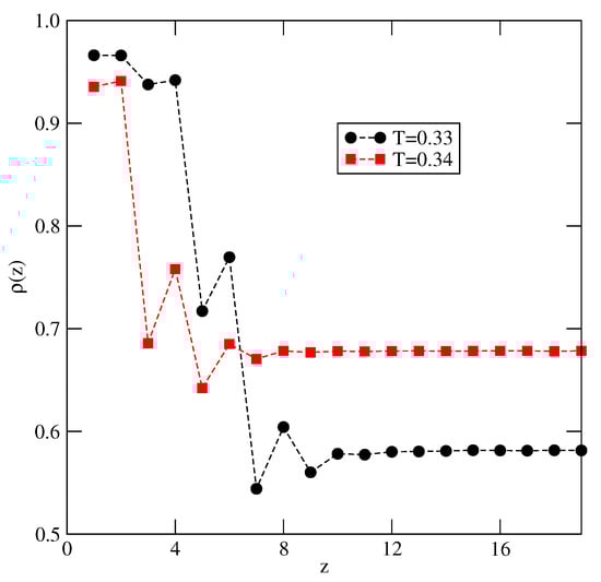When decreases, and approaches the limiting value of , the critical temperature of the first layering transition, , decreases. For example, for , the recorded isotherms at and (see Figure 17) show that the critical temperature of the transition is lower than 0.32. It should be also noted that already below the critical temperature of 0.3, the first layer assumes quite high density at the first layering transition point.