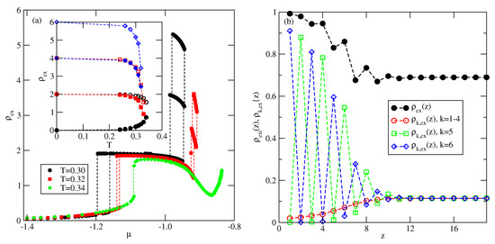 In the case of , the phase behavior changes, since the transition does not appear at all. Instead, a series of transitions, with even and odd n, occurs (see Figure 10a). The formation of thicker films occurs in a similar way as in the systems with , but the crossover between the regimes in which even and odd numbers of layers are stable is shifted towards considerably lower , close to .