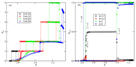When only odd numbers of occupied layers are stable, and the complete wetting at occurs only for greater than about . Independently of the film thickness, all particles in the first layer assume the same orientation with , i.e., with their A halves pointing towards the surface. Each of the subsequent layering transition adds two layers with the orientations 6 and 5, due to strong interlayer attraction. Since the assumed here strengths of the fluid–wall interactions are rather small, a gradual decrease of causes the first layering transition to involve a simultaneous condensation of an increasing number of layers. When , the ground state behavior becomes different (see Figure 9b). Namely, the films with even numbers of occupied layers appear only for sufficiently weak attractive BB interaction. It should be noted that the transition is preserved, and the formation of a bilayer involves the reorientation of particles in the first layer from to . In the second layer all particles assume the orientation with , since this stacking is energetically favorable due to strong interlayer attraction. When the BB interaction becomes strong enough, multilayer films with only odd numbers of filled layers appear. Over a very narrow range of , between the regimes with even and odd numbers of occupied layers, the films grow in a layer-by-layer mode.