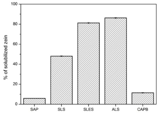 - Moore, P.N.; Puvvada, S.; Blankschtein, D. Role of the surfactant polar head structure in protein-surfactant complexation: Zein protein solubilization by SDS and by SDS/C12En surfactant solutions. Langmuir 2003, 19, 1009–1016. [Google Scholar] [CrossRef]