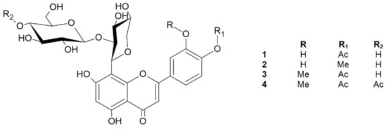 5,7-dihydroxy-3′-methoxy-4′-acetoxyflavone-8-C-β-d-xyloside-2′′-O-glucoside (3): yellow amorphous powder; HPLC rt, 55.2 min; HRESIMS m/z = 637.18 [M + H]+ (calculated for C30H31O16); UV λmax nm: 253, 271, 347; +NaOMe: 266, 404; +AlCl3: 277, 392; +NaOAc: 273, 352; +H3BO3: 212, 346; NMR spectral data, see [2] and Figures S19–S23 in the Supplementary Materials.