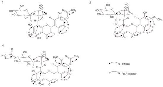 Important 1H-1H COSY and HMBC correlation of compounds 1, 2, and 4.