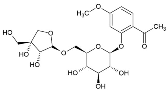 Compound 5 was obtained as a yellow amorphous powder. The molecular formula C20H28O12 was deduced from its positive mode HRESIMS, which showed a molecular ion peak [M + H]+ at m/z 460. In the 1H NMR spectrum, the peaks between δ 6.50 and δ 8.00 correspond to hydrogen atoms in the aromatic ring. Furthermore, the signals at δ 7.68, δ 7.58, and δ 7.23 indicate the presence of substitutions on C1, C2, and C4, respectively [13]. Furthermore, HSQC correlations verified the δ 124.6 (C1), 112.4 (C2), and 116 (C4) signals in the 13C spectrum. In addition, a singlet at δ 2.58 indicated the presence of a CH2 group, where the hydrogens do not interact with any other protons. Based on chromatographic, spectral analysis and the literature data, compound 5 was established as apiopaenonside (Figure 3), which was previously isolated from Paeonia suffruticosa [19,20].