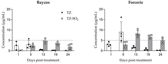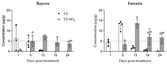 Overall, the concentrations of TZ and TZ-SO2 were higher and more sustained following intramuscular application, and there was a strong correlation between plasma and tissue concentrations of both TZ and TZ-SO2 (R2 > 0.90).
