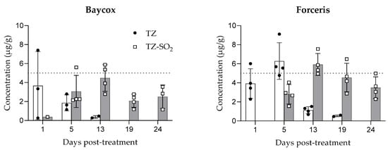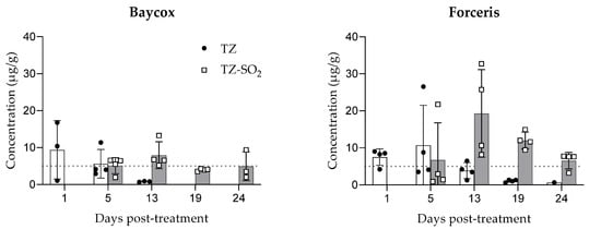 Following oral application, the highest TZ concentrations in intestinal tissues were measured at the first sampling (24 h post treatment). A continuous decrease was observed from day 1 to day 13 post-treatment and the last quantifiable concentrations were observed on days 13–19. Following intramuscular application, the highest TZ concentrations in intestinal tissues were measured at 5 days post-dosing and the last quantifiable concentrations were observed on days 19–24. The concentrations of both TZ and TZ-SO2 were higher in the jejunal tissue than in the ileal tissue (Figure 2 and Figure 3).