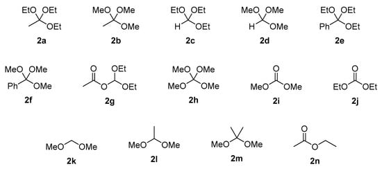 - Yoshino, T.; Imori, S.; Togo, H. Efficient esterification of carboxylic acids and phosphonic acids with trialkyl orthoacetate in ionic liquid. Tetrahedron 2006, 62, 1309–1317. [Google Scholar] [CrossRef]
