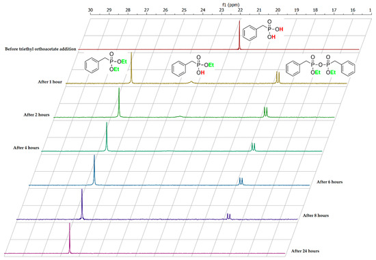 The gain insight into the reaction mechanism, additional experiments were performed on one of the model substrates—benzylphosphonic acid 1b—with selected donor 2a at 30° and 75 °C. Close inspection of 31P NMR spectra of crude 3b product obtained in reaction at 30 °C did not show any additional signals from possible reaction intermediates (see Supplementary Materials Section S2.3). However, in the reaction performed at the higher temperature, an interesting phenomenon was observed. Formally, before the reaction had started, the spectrum of the substrate 1b was measured. It is at the top of Figure 2 and shows a single peak at 21.3 ppm. After the addition of triethyl orthoacetate and heating the reaction mixture for 1 h at 75 °C, the NMR spectra changed substantially. The signal associated with substrate 1b diminished almost to zero and four new signals appeared on the spectra. The main peak at 26.5 ppm comes from diester 4b. The amount of product 4b increased rapidly during this first hour and reached a maximum after 24 h. The small and broad signal at 23.3 ppm represents monoester 3b. The most significant peak of the 3b product appeared in the first spectrum (after an hour). Further measurements demonstrated that the amount of 3b dropped close to zero after 8 h. Surprisingly, two new signals at 18.65 and 18.77 ppm of similar intensity appeared. Close inspection of literature data [40] allowed us to assign those two signals to diastereomers 6a and 6b of pyrophosphonate 6 (Figure 3). The appearance of compound 6 as a reaction intermediate is a valuable clue to the reaction mechanism.