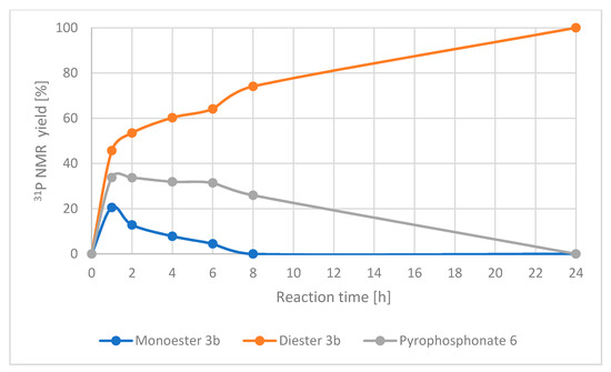 The calculated 31P NMR yield of pyrophosphonate 6 reached 34% after 1 h and its amount remained at a similar level for the next 5 h and then slowly decreased to zero. The detailed data from the 31P NMR spectra analysis are summarized in Table S1 (SI). To sum up, the NMR spectra recorded during the reaction course showed that the amount of diester 4b was continuously increasing with time while amounts of 3b and 6 reached a kind of plateau and then were diminished to zero after 24 h. As mentioned above, at a lower reaction temperature (30 °C) signals from pyrophosphonate 6 were not observed and a higher reaction temperature was required to transform monoester 3b into pyrophosphonate 6 and finally into diester 4b. The graphical representation of the results described above is shown in Figure 4.