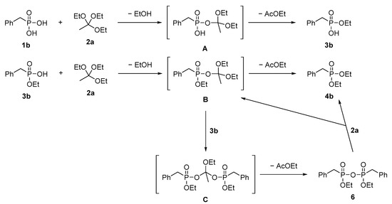 The analysis of obtained data provided some insight into the reaction mechanism (Scheme 2). The first step is the reaction between triethyl orthoacetate (2a) and benzylphosphonic acid (1b) which leads to the formation of an unstable intermediate A. It readily decomposes to monoester 3b by releasing one molecule of ethanol and ethyl acetate in a two-step process, at room temperature. The intermediate A can be formed only from selected substrates used as alkoxy group donors, depicted in Figure 1. This mechanism allowed us to explain why only monophosphonates were formed from orthoesters 2a and 2b, diethoxymethyl acetate 2g and tetramethyl orthocarbonate 2h. At higher temperatures, monoester 3b reacts with a second molecule of triethyl orthoacetate to give intermediate B, similar to A. This intermediate can react with the second molecule of monoester 3b to give compound C which is readily transformed into pyrophosphonate 6 and its structure was ambiguously assigned by kinetic experiments. Compound 6 reacts with the third molecule of orthoester 2a to give the final product diester 4b and intermediate B. According to this mechanism, for the formation of one molecule of diester 4, three molecules of orthoester 2a are required. This readily explains why the larger amount of triethyl orthoacetate favors double esterification with respect to monoesterification.