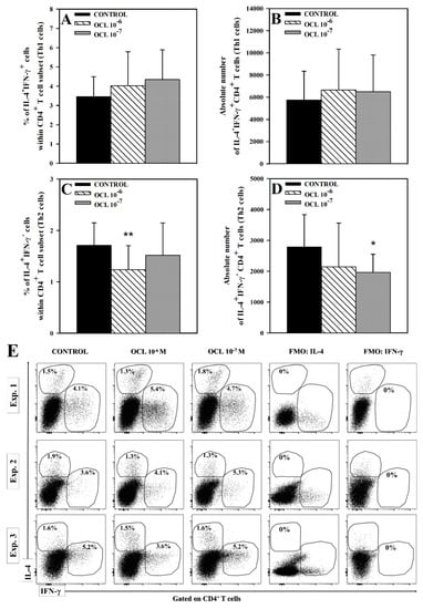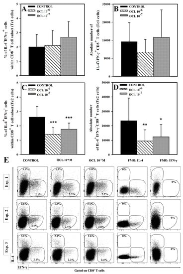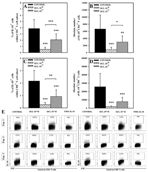 The research demonstrated that exposure of cells to OCL in both concentrations caused a significant reduction in the percentage of IL-10+ cells within both CD4+ and CD8+ T cell subsets (p < 0.001; Figure 4A,C), as well as in the absolute counts of IL-10+CD4+ (p < 0.001 (10−6 M), p < 0.01 (10−7 M); Figure 4B) and IL-10+CD8+ (p < 0.001; Figure 4D,E) T cells. The OCL 10−6 M-induced reduction in the absolute counts of IL-10-producing CD4+ and CD8+ T cells was extremely profound, because the values of these parameters constituted only 13% and 7% of corresponding control values, respectively. It should be noticed that the percentage (p < 0.001) and absolute count (p < 0.05) of IL-10-producing CD4+ T cells, and the percentage (p < 0.01) of IL-10-producing CD8+ T cells were significantly lower in the cultures treated with OCL 10−6 M compared to those exposed to OCL 10−7 M. Thus, it can be stated that, under the condition of this study, OCL 10−6 M almost completely abolished IL-10 production in CD4+ and CD8+ T cells. Moreover, the results obtained indicate that this inhibitory effect on IL-10 synthesis can be dose-dependent.