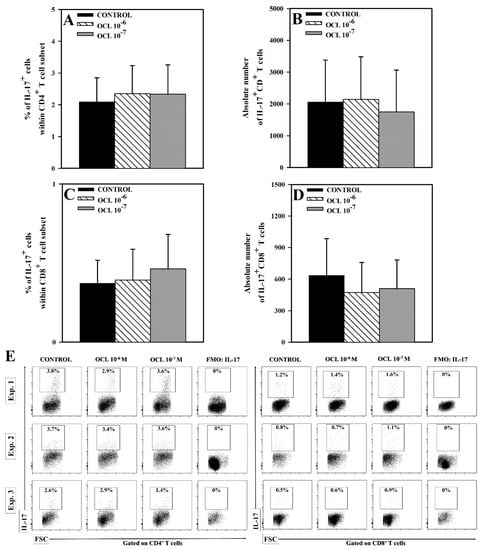 No effect of OCL (at either concentration) on the percentage and absolute count of IL-4−IFN-γ+CD4+ cells was observed (Figure 1A,B,E). Exposure of cells to OCL 10−6 M reduced the percentage of IL-4+IFN-γ− cells within CD4+ T cell subset (p < 0.01), but did not significantly affect the absolute number of these cells, although, a certain trend toward this effect was observed (p = 0.164, the mean value of this parameter was 2792 (control) versus 2143 (OCL 10−6 M); Figure 1C–E). On the contrary, OCL at the lower concentration did not affect the percentage of IL-4+IFN-γ−CD4+ cells, but reduced the absolute count of these cells (p < 0.05; Figure 1C–E). The studies did not reveal a statistically significant effect of OCL on the percentage and absolute count of IL-4−IFN-γ+CD8+ T cells. Exposure of cells to OCL considerably reduced the percentage of IL-4+IFN-γ− cells within CD8+ T cell subset (p < 0.001; Figure 2C) and an absolute count of these cells (p < 0.01 (10−6 M), p < 0.05 (10−7 M); Figure 2D). No effect of OCL (at either concentration) on the percentage and absolute count of IL-17-producing CD4+ and CD8+ T cells was found (Figure 3). The results indicate that OCL did not affect the number of CD4+ and CD8+ T cells capable of IFN-γ and IL-17 production but abolished IL-4 production in a significant portion of CD4+ and CD8+ T cells.