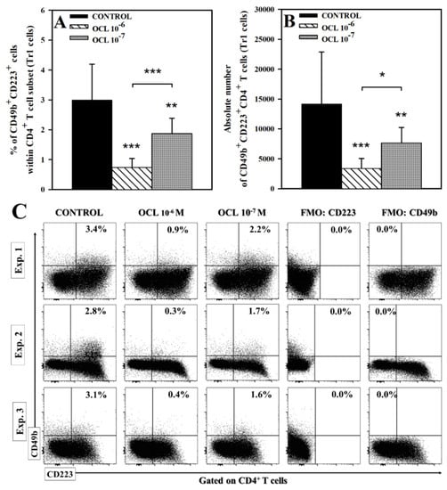Treatment with OCL led to a significant reduction in the percentage and the absolute count of CD49b+CD223+CD4+ T cells (p < 0.001 (10−6 M), p < 0.01 (10−7 M); Figure 5). It was demonstrated that the values of these parameters were considerably lower in the cultures treated with OCL 10−6 M compared to those exposed to OCL 10−7 M (p < 0.001 and p < 0.05, respectively). The drug-induced reduction in the absolute count of CD49b+CD223+CD4+ T cells was very profound, because the values of these parameter in the samples from the cultures treated with OCL 10−6 M and 10−7 M constituted 25% and 55%, of the corresponding control values, respectively. These results indicate that OCL counteracted the induction of CD49b+CD223+CD4+ T cells and this effect was dose-dependent.