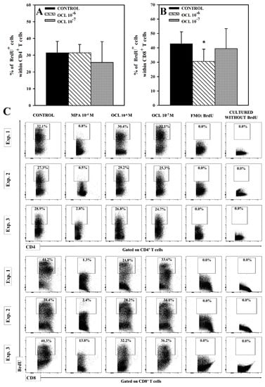 No effect of OCL on the percentage of 5-bromo-2’deoxyuridine(BrdU)+ cells within CD4+ T cell was observed (Figure 6A,C). However, the studies demonstrated that OCL at 10−6 M concentration, but not at 10−7 M, reduced the percentage of BrdU-incorporating cells within CD8+ T cell subset (p < 0.001; Figure 6B). The results indicate that OCL diminished the proliferation of CD8+, but not CD4+, T cells.