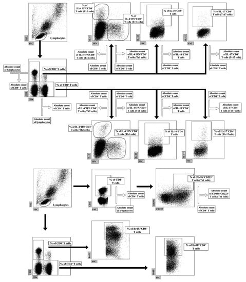 Flow cytometry analysis was performed using a FACSCelesta cytometer (BD Biosciences, San Jose, NJ, USA). The data were acquired by FACSDiva version 9.0 software (BD Biosciences, San Jose, NJ, USA) and analyzed by FlowJo software (Tree Star Inc., Stanford, CA, USA). Absolute cell counts (i.e., number of cells from a particular subpopulation per tissue sample) was calculated using the dual platform method, i.e., the absolute cell count was determined by calculating the data obtained from a cell counting chamber by the percentage of particular cell subsets, as illustrated in Figure 7.