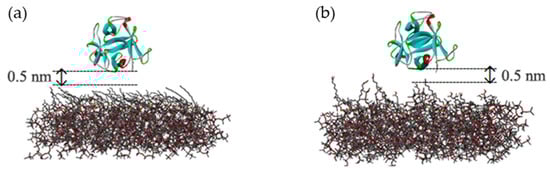 Initial configuration of system: (a) protein on the surface of CH3-SAM membrane; (b) protein on the surface of COOH-SAM membrane.