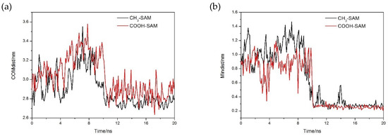 In Figure 2, the centroid distance between mussel protein and polymer membrane was calculated, and the variation of minimum distance with time evolution was shown. It is obvious that the distance between mussel protein and polymer membrane for the two systems decreased rapidly and reached equilibrium at a short simulated time, indicating that mussel protein can reach a stable adsorption state for the present simulated model at a short simulated time. We noted that the distance between protein and membrane fluctuated greatly, which indicated that protein constantly adjusted its own configuration during the process of adsorption until an optimal site for adsorption was finally obtained [13,14,15,16].
