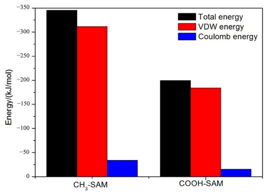 After the adsorption equilibrium of protein was obtained, the residue types of amino acid of protein on the CH3-SAM and COOH-SAM polymer antifouling membrane can be divided, and the results are shown in Table 1. By comparing the residue types of mussel proteins on different self-assembled membrane surfaces, we noted that the nonpolar residues are major on the surface of CH3-SAM membrane, while the polar residues are major on the surface of COOH-SAM membrane (Figure 3). We speculate that the surface of protein contains hydrophilic polar residues, and the hydrophobic nonpolar residues are mostly in its interior of spherical protein. When the protein interacts with the CH3-SAM membrane, the hydrophobic residues can be turned over from the interior and form the better combination between the hydrophobic CH3-SAM surface and hydrophobic residues of protein. In order to prove the speculation, we calculated the interaction energy between mussel protein and two self-assembly membranes, respectively. As shown in Figure 4, it is obvious that the non-bond interaction energy between CH3-SAM membrane and mussel protein is greater than that between COOH-SAM membrane and the protein. This shows that the hydrophobic surface has a stronger effect on mussel protein molecules, and the adsorption of mussel protein on its surface is more stable and difficult to be separated. At the same time, we noted that the proportion of van der Waals (VDW) interaction is much larger than that of Coulomb interaction during the simulation process. For CH3-SAM surface, the VDW energy is about 320 kJ/mol, which is approximately 94% contribution to the total energy. While the VDW energy for COOH-SAM surface is about 180 kJ/mol, contributing to 90% to the total energy. These indicate that the driving force of protein adsorption is mainly van der Waals interaction between protein and membrane [26].