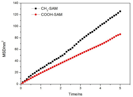 Table 2 lists the Ds of water molecules in the hydration layer and bulk phase. It was found that the D of water molecules in the hydration layer decreased compared with that in the bulk solution for the two systems. It indicates that the interaction between the surface of materials and water molecules restricted the diffusion of water molecules on the membrane surfaces, especially for the COOH-SAM system. It also shows that the binding ability of COOH-SAM self-assembly membrane to water molecules is relatively stronger. Meanwhile, we also noted that the D of water molecules in the vertical direction is much lower than that in the horizontal direction, indicating that the solvent layer molecules are difficult to separate from the surface of the self-assembled membrane.