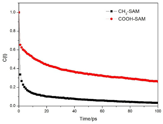 Figure 6 shows the relationship of C(t) and the time t. It can be seen that the autocorrelation functions of water molecules on the two membrane surfaces show the same trend of decay, and the decay of water molecules on CH3-SAM membrane surface is relatively fast. Fitting the curve using the equation , the relaxation time τμ can be calculated. Table 2 lists the τμ of hydrated layer molecules and bulk water for the different self-assembled membranes. Due to the existence of polymer membrane, the relaxation time of the surface hydration layer molecules is longer than that of the bulk phase water. It explains that both polymer membranes have limiting effects on the surface hydration layer molecules. The COOH-SAM membrane has greater limiting effect on the hydration layer molecules. Meanwhile, the number and life of hydrogen bonds (HBs) formed between water molecules and self-assembled membrane are also listed in Table 2. The data showed that the number of HBs formed between water molecules and COOH-SAM polymer is relatively stronger, and the life of HBs is relatively long. These also explained the reason why water molecules and COOH-SAM polymer can form the strong hydrogen bonding structure.