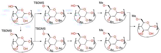 Cyclodextrin (CD) research has increased exponentially during the last fifty years. Currently, the number of derivatives for all three natural CDs is in the range of several thousands. Due to this wide variety of derivatives, one can wonder how these functional groups affect the general properties of CDs and what specific site should be changed for a particular application; for example, whether an increased water solubility or greater stability of the guest in the CD cavity is desired. The answer was partially given by Wenz [1], when through isothermal titration microcalorimetry, he established the binding constants of 4-tert-butylbenzoate and adamantane-1-carboxylate with all methylated β-cyclodextrin derivatives. These results reveal that by blocking the primary hydroxyl side of β-cyclodextrin (β-CD), there is not only the benefit of increased water solubility, that all methylated derivatives display, but the maximum binding constant for the inclusion complexes in this series of methylated β-CDs can also be obtained. Although a complete change of all 21 hydroxy groups is relatively easy to perform in one step and the yield is quantitative, as demonstrated for per-O-methylated cyclodextrins using Haworth [2] and Irvine–Purdie methylation [3,4] or per-O-(2-hydroxypropyl) cyclodextrins [5], selective primary side derivatization is still in the early development stages, with one notable exception being the modified Appel reaction [6]. This reaction is used as the first step to synthesize per-6-halogeno-per-6-deoxy cyclodextrins, the γ-cyclodextrin variant being the precursor for octakis[6-(2-carboxyethylthio)-6-deoxy]-γ-cyclodextrin sodium salt also known as Sugammadex [7], one of the most successful cyclodextrin derivatives. The success of Sugammadex to selectively remove only the general anesthetic, and thus being the first selective relaxant binding agent, it gives some hints about the increased practicality of primary-side-substituted cyclodextrins as a more potent guest carrier. Another path for the primary side substitution is carried out using the classical organic chemistry protocols of protecting groups and numerous steps until the final desired product is obtained. These protocols employ the use of tert-butyldimethylsilyl chloride for primary side protection followed by a wide variety of secondary side protection (methylation, acetylation, benzylation, etc.) [8] with subsequently improved variants [9] and a relatively recent work by the cyclodextrin specialized laboratory CycloLab [10]. Moreover, even though highly efficient steps are now available, the multiple-step reactions needed to achieve the result bring down the total yield of the reaction to a reported value ranging between 40% and 70% [9,10]. All the above-mentioned syntheses, summarized in Figure 1 offer good but expensive commercial products.