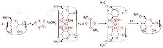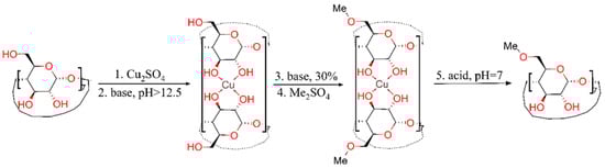 One workaround employed in the industry is the use of cheap randomly substituted cyclodextrins. Their synthesis is almost always comprised of one step, followed by a simple purification workup. The drawback for these types of syntheses is the resulted mix of isomers characterized by an average degree of substitution (DS) following the normal Gaussian distribution. If the manufacturer does not follow good manufacturing practices, this normally distributed abundance of isomers can be affected, and for the same DS, one can have differently shaped distributions [11], affecting the reproducibility of proprieties of the end product. One of the easiest isomers to produce, and at the same time most studied, is the randomly substituted β-CD. For example, the phase-transfer catalysis method of methylation with dimethyl sulfate which produces a DS of 12.4÷13.2 is called RAMEB [12]. A similar DS was obtained using CH3I [13], CH3Cl [14] or dimethyl carbonate, although the last reaction was performed in dimethylformamide solvent [15]. The influence of different reaction times and several strong bases on the DS and substitution pattern was investigated [16,17,18]. One of the earliest uses of copper chelates as temporary protection for selective acylation of aminoglycoside antibiotics was reported by Hanessian in 1978 [19]. Although pure cyclodextrins metal complexes are said to have only a few applications in Bellia’s extensive review [20], in the same year, Masurier et al. used a copper(II)-β-cyclodextrin complex to synthesize 3-O-substituted β-cyclodextrin derivatives [21]. A sandwich copper-β-cyclodextrin was used to direct the tosylation only to primary hydroxyls groups, avoiding secondary side products [22]. With these sandwich-type complexes, the CDs are forming dimeric structures in which the secondary hydroxyl groups are coupled together by a ring of metal ions [23,24]. This complex is formed in one step and requires a basic medium to be stable, which is needed for the methylation reaction. The coordination of copper(II) ions, as proven by X-ray diffraction crystallography, is square-planar, with both secondary hydroxy groups of each glucose unit involved in the coordination. Herein, this study aims to provide a novel chemical shortcut of the classical procedure involving a series of five steps for the protection and deprotection of hydroxyl groups (both primary and secondary) belonging to β-cyclodextrin in a single stage, consisting of only in situ protection of secondary hydroxyl groups. This new synthesis route is exploiting the well-known ability of cyclodextrins to form coordination compounds with metals. In this respect, the copper(II) ion was chosen due to its dsp2 hybridization (by combining a 3dx2-y2 orbital with one 4s and two 4p orbitals, respectively) and its proper ionic radius which facilitates coordination in a square planar geometry with two secondary hydroxyl groups of a glucopyranose unit of a cyclodextrin on one side of the plane and two other similar groups of another cyclodextrin molecule oriented on the other side of the plane. The result is a sandwich structure with copper(II) ions in the middle, coordinating and blocking the reactivity of these functional groups. The coordination complex stability is enhanced when pH becomes increasingly alkaline, favoring a Haworth-type methylation by using dimethyl sulfate as an alkylating agent. The chemical reactions associated with this protection procedure are schematically illustrated in Figure 2.