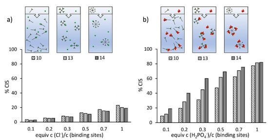 Considering the uncertainty in CIS determination, the titration of receptors 10, 13 and 14 with TBA+Cl− led to very similar results in all cases, regardless the count of binding sites per one molecule (Figure 1). The weakly bound chloride probably does not have a convenient shape and size for cooperative bonding to the dendritic receptors and no effects similar to those observed for dihydrogen phosphate can be followed. The same results were obtained by the competitive experiments; the binding isotherms for sole 10 did not differ much from those measured for 10 in the mixture with a dendritic receptor, confirming low influence of binding sites cumulation on chloride complexation.