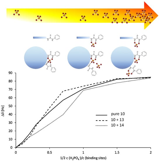 Comparison of H2PO4− binding isotherm of pure 10 with the corresponding binding isotherms of 10 in the presence of 13 and 14, respectively (shift of ArH; H at C3/5, Figure S64). For clarity, lines are used to connect the experimental data points.