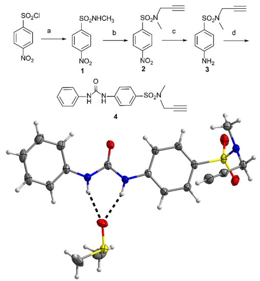 4-Nitrophenylsulfonylchloride was reacted with methylamine in water in the presence of pyridine providing 1 in almost quantitative yield. The propargyl group was introduced to the molecule via alkylation with propargyl bromide in the presence of base resulting in the formation of 2. The nitro group was reduced using tin(II) chloride in ethanol, leaving the triple bond intact. The ureido group, serving as a complexation site, was formed in the reaction of the amino group of 3 with phenyl isocyanate providing compound 4 as orange crystals suitable for single crystal X-ray diffraction analysis. Apart from the structure approval, the crystallography confirmed the L-shape of 4, typical for sulfonamides. The hydrogen-binding capability of the ureido moiety is suggested by a non-covalently bound molecule of dimethylsulfoxide (DMSO).