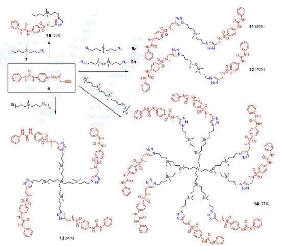 The carriers for attachment of the receptor moieties were based on carbosilane molecules differing in the number of azido groups within the structure (Scheme 2). The respective starting azides were prepared according to published procedures [27,28,29], except 7 and 9a. The synthesis of compound 7 started with reaction of butyllithium with chloro(3-chloropropyl)dimethylsilane, giving 5 in 91% yield. The silane 5 was either converted to iodo-derivative 6 by Finkelstein reaction or directly reacted with sodium azide to obtain 7. The compound 9a was obtained in two steps from (3-chloromethyl)dimethyl silane. Its Ir-catalyzed addition to allylchloride gave 8a together with 8b in approx. 1:1 ratio. The subsequent treatment of the obtained mixture with sodium azide under the conditions of nucleophilic substitution yielded a mixture of the corresponding azides 9a and 9b.
