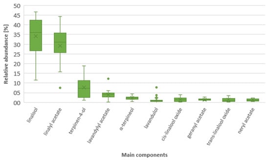 Relative abundance of the main components in the studied lavender essential oils. The box section represents the interquartile range (the results between quartile Q1 and Q3). A straight line intersecting the box represents the median, and a cross represents the average value. Whiskers represent the lowest and highest results, and separate points represent outlying values.