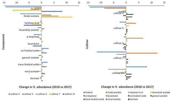 Inter-year (2018 vs. 2017) changes of relative % abundancies of the main oil components cropped from the different studied lavender cultivars. The left plot highlights changes for oil components and the right plot highlights changes for cultivars.