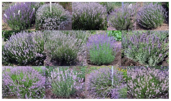 Illustrative photos for the specimens of different studied lavender cultivars: (A) 2-15 (1); (B) Victoria (2); (C) 1-4-09 (3); (D) Lidia (4); (E) 1-3-16 (5); (F) 1-4-09 (6); (G) Alba (7); (H) 2-1-17 (8); (I) 2-2-3 (9); (J) 2-4-6 (10); (K) 701-2 (11); (L) 21-19 (12); (M) Rosea (13).