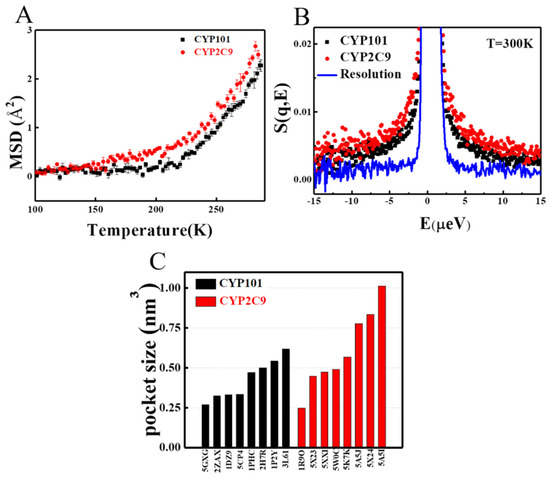 As seen in Figure 1A, CYP2C9 can catalyze a much broader range of chemically and structurally different substrates as compared to CYP101, implying that CYP2C9 should have much greater structural flexibility. To examine this, we performed neutron scattering on these two CYP450s hydrated in D2O. As neutron is highly sensitive to hydrogen atoms, the measured signals, thus, primarily reflect the dynamics of proteins [24,25,26]. As evident by Figure 2A, CYP2C9 has significantly larger mean-squared atomic displacement (MSD), i.e., much more flexible, as compared to CYP101 above 150 K. We note that, at lower temperatures, proteins will behave as harmonic solids without functions [27,28]. In addition to MSD, we also measured the quasi-elastic neutron spectra over the energy range from 1 μeV to 15 μeV, denoted as S(q, E), which furnishes the distribution of the dynamical modes in the time window from 60 ps to 1 ns. As can be seen in Figure 2B, the S(q, E) of CYP2C9 is significantly broader than that of CYP101, revealing that the internal motion of the former is faster. Moreover, we examined the local flexibility of the two CYP450s at the catalytic pockets by comparing their crystal structures when binding to different substrates. As can be seen in Figure 2C, the pocket volume of CYP2C9, calculated using the Pocket Volume Measurer (POVME) program [29,30], can change from 250 to 1000 Å3, while that of CYP101 is limited in the range from 250 to ~600 Å3. Hence, the catalytic pocket of CYP2C9 has much greater flexibility to accommodate distinct substrates.