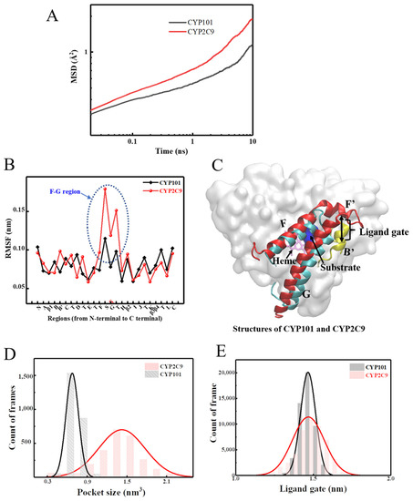 To complement the experimental studies, three independent 500 ns long all-atom molecular dynamics (MD) simulations on each of the two proteins, CYP101 and CYP2C9, were conducted. Detailed simulation protocols are provided in Materials and Methods. The results of mean-squared atomic displacement (MSD) for each trajectory are presented in Figure S5 showing that results obtained from each trajectory are as similar as each other for a given protein. To improve statistics, the analysis for both CYP101 and CYP2C9 was conducted by averaging over the three 500 ns trajectories. Indeed, CYP2C9 has greater overall mobility as evidenced by the larger MSD derived from MD simulations in Figure 3A, confirming the observations of the neutron experiments (Figure 2A). To identify the local regions that mostly contribute to the difference in the structural flexibilities between the two proteins, we compared the root-mean-square fluctuation (RMSF) of their local structures. The comparison presented in Figure 3B is based on the secondary structures instead of residues, as the two CYP450s share similar secondary structures while baring low sequence identity (19.22%). As can be seen, the major dynamical difference of the two CYP450s lies in the F–G region, which is composed of the long helices of F and G, and the linker between them. This F–G region serves as the lid to cover the catalytic pocket, and the linker connecting F and G helices together with the B’ helix gates at the entry of the ligand into the catalytic pocket [31,32,33,34] (see Figure 3C). In CYP101, the linker is a short peptide chain (F–G loop), while it is a long coil plus a small helix F’ in CYP2C9 that can adopt much more conformational changes (Figure 3C). As a result, the much greater flexibility of the whole F–G region in CYP2C9 renders larger fluctuation at the catalytic pocket (Figure 3D and Figure S2 in Supplementary Materials, SM) and at the gate of the ligand access channel (Figure 3E) to accommodate different substrates.