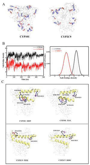 The intriguing question thus arises as to why CYP2C9 has such great structural flexibility, especially around the ligand gate and the pocket area. As generally recognized, the protein internal mobility is often controlled by inter-residue interactions, such as intra-protein hydrogen bonds [39], salt bridges [40,41,42], and hydrophobic interactions [43,44] (mostly interactions between aromatic residues), as well as protein-water hydrogen bonds [45,46,47]. By thoroughly comparing the structures of the two CYP450s in Figure S3 of SM, we can unambiguously exclude the factors: hydrophobic interactions (Figure S3A,B and Table S1), intra-protein hydrogen bonds (Figure S3C), and protein–water hydrogen bonds (Figure S3D) as the cause for the dynamical difference observed between the two CYP450s. Subsequently, we analyzed the salt bridges in the two proteins. As can be seen in Figure 4A and Table 1, CYP101 has many more salt bridge pairs. The salt-bridge density, defined as the number of salt bridges per 100 amino acids in a protein, is 7.4 as found in 500 ns simulations of CYP101 (PDB: 1DZ9), more than twice of that (3.5) in CYP2C9 (PDB: 5XXI). Such a drastic difference in salt-bridge density is also confirmed in MD simulations, by which it is found to be 5–8 in CYP101, much higher than the value of 3–6 in CYP2C9 (Figure 4B). As a salt bridge furnishes strong inter-residue interactions (~3–5 kcal/mol) [48,49,50], its greater population in CYP101 will inevitably lower the global flexibility of the protein (see Figure 2 and Figure 3A).