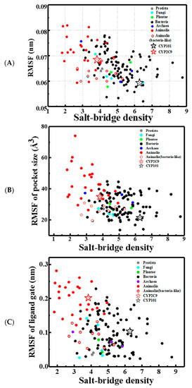 The correlation between the salt-bridge densities, i.e., the number of salt bridges per 100 residues in the protein, with (A) the overall internal mobility of the enzyme, defined as the room-mean-squared fluctuation (RMSF), (B) the flexibility of the catalytic pocket, defined as the room-mean-squared fluctuation of pocket volume, and (C) the flexibility of ligand gating area, defined as the room-mean-squared fluctuation of the distance of the ligand gate from F/G loop to the B’ helix (e.g., the CYP101 was defined by the distance between Ser190 in the F/G loop and Pro89 in the B’ helix). Here, 146 different kinds of CYP450 proteins were studied, and 10 ns MD trajectories were conducted for each protein to obtain these quantities. The data are colored by their biological categories: Fungi (cyan), Archaea (blue), Bacteria (black), Protista (grey), Animalia (red solid spheres), and Plantae (green), with CYP101 and CYP2C9 highlighted by starts and several bacteria-like animal CYP450s labeled by red empty circles. The Pearson Correlation Coefficient [52] for (A–C) are −0.43, −0.38, and −0.46, respectively, which are statistically meaningful and qualitatively supports the hypothesis that the salt bridges play an important role in restraining the structural flexibilities for all CYP450 proteins in the superfamily.