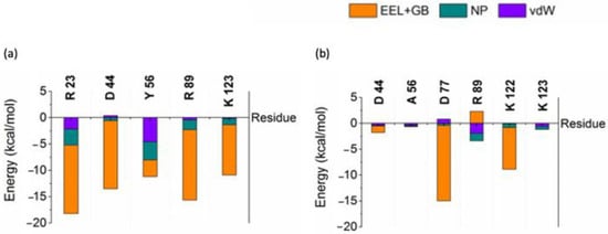 Interaction free energy (IE) of residues was calculated by decomposing the binding free energy into vdW, non-polar contributions to the solvation free energy (NP) and the sum of electrostatic interactions (EEL) and electrostatic contribution to the solvation free energy components (GB) to identify the important residues contributing for the binding affinity using residues within close contacts (4 Å) between AnkGAG1D4/AnkGAG1D4-Y56 and CA. Key residues R23, D44, Y56, R89, and K123 of AnkGAG1D4 shown in Figure 1 were previously identified [] for their crucial role in binding affinity observed to have remarkable low IE with major contribution from the sum of EEL and GB. Interactions of D44, Y56A, R89 and K123 with CA reduced drastically as IE went higher in AnkGAG1D4-Y56-CA. IE Y56A increased the most among the key residues, about 95%, from −11.17 kcal/mol to −0.65 kcal/mol.